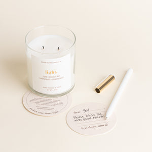 Packaged with two-wick candle, sturdy protection sleeve, and prayer coaster.